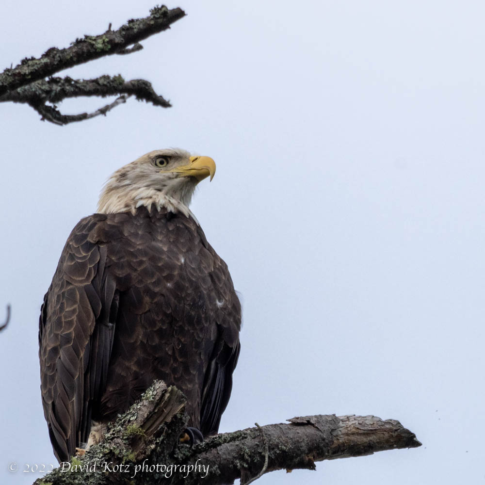 As I was rowing on the river this morning, I scanned the tall riverside trees to see whether I might see anything interesting, as is my habit. Unlike other days, today I spotted the telltale white head of a bald eagle, high in the branches of a distant dead snag. I turned around, headed home, grabbed my camera, and drove up the road to that location. This was a great opportunity to test my new 800mm lens!