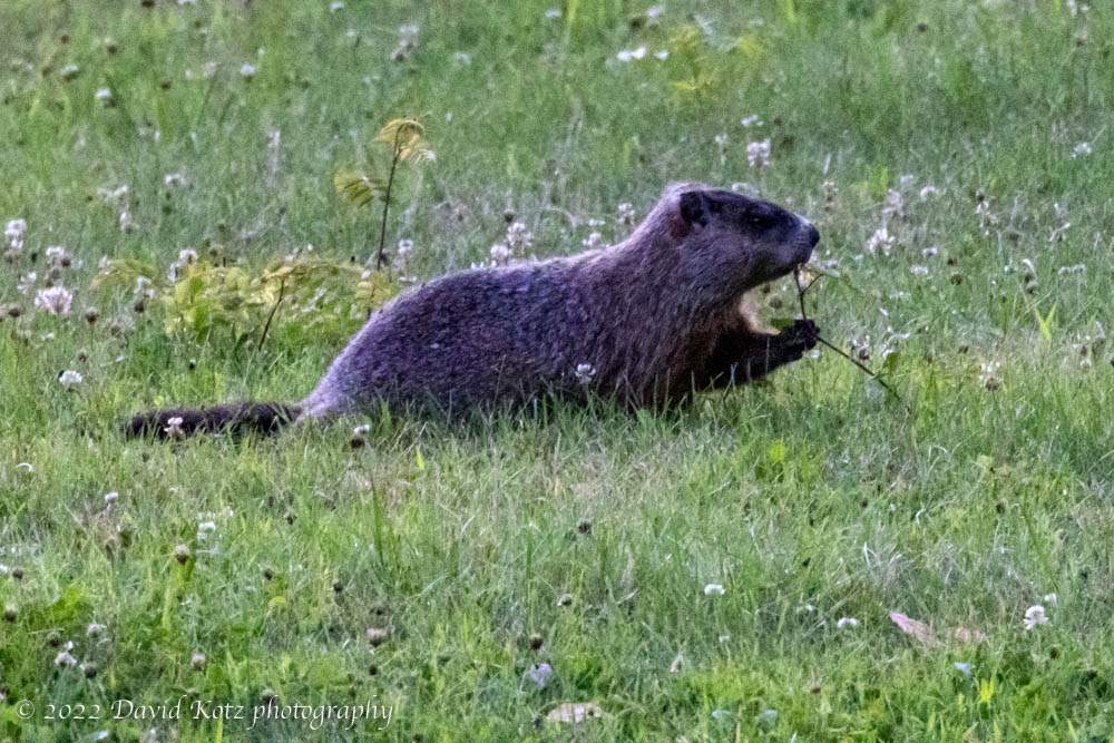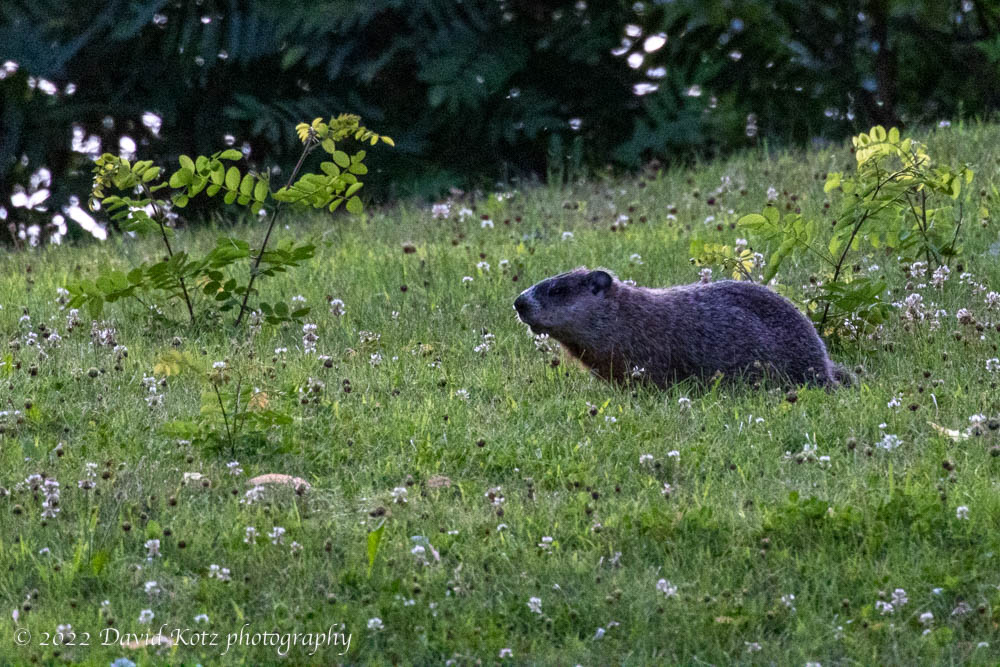 After sunset, and as the summer evening fades into twilight, our friendly neighborhood groundhog comes out to browse. (I think he lives under our storage shed.) He’s quite shy, so I snapped a few photos from the deck – using my new 800mm lens plus a 1.4x teleconverter (effective 1120mm). The combination is fixed at f/16 and, combined with the deepening twilight, the photos are a bit noisy. Still, he’s a cute fellow!