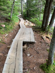 I started along the west side of the Jordan Pond Loop Trail. This trail is popular with families because it follows the lake shore all way ’round, is basically flat, and mostly easy going – a gravel sidewalk on the east side, and a kilometer-long boardwalk on the muddy west side. Indeed, the boardwalk cleverly includes periodic ‘pullouts’ where people can pass… I stopped at one to let a stroller roll by. The purpose of these boardwalks is to protect the shallow soils and tree roots.