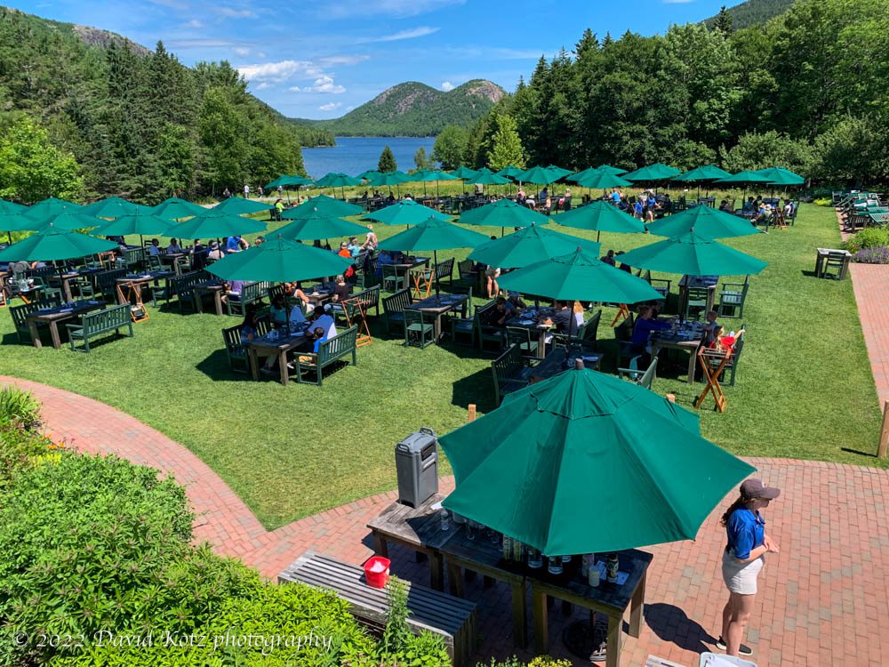 Continuing south down the ridge, then dropping steeply (like, really steeply) down the Spring Trail, to return to Jordan Pond. (I chose the Spring Trail because it was only 0.2 miles whereas the ridge trail, and looping back, would have been 1.2 miles!) Seeing a sign for Jordan Pond House, I thought I’d stroll by to see what its view might bring. Here I discovered, by asking, that it was indeed possible to get a table for lunch, out on their lawn – despite the website earlier indicating a 3-week wait for reservations. It was 11:30am and my tummy urged me not to pass up this opportunity!