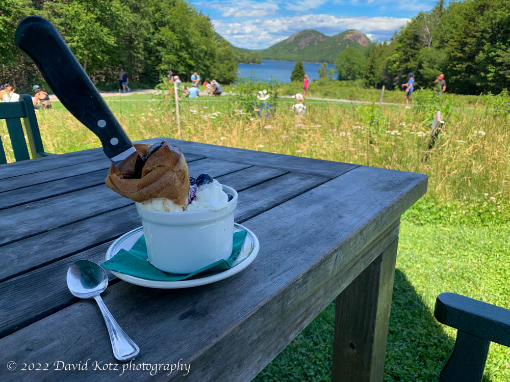 So I took the offer, and ended up at the very best table, closest to the water and the views across the lake. After my lunch I had to order popovers for dessert, of course – Jordan Pond House has been famous for its popovers for over 125 years – and elected the Popover Sunday with blueberry sauce. Maine blueberries are in season, judging by the wild blueberries I’d snacked along my hikes. mmmm.
