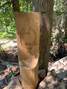 I continued north and down, down a steep trail back to the pond. So steep, in fact, that at one place I was given a choice of “Ledge or Ravine”. I chose the Ravine – it was shady and cool – and found myself climbing down a steep ladder in a narrow crevice.