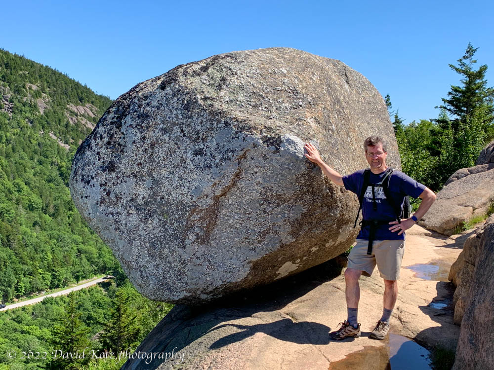 Not ready to quit now, I crossed the road and scrambled up South Bubble – one of a pair of bumps called The Bubbles – to visit Bubble Rock, a glacial erratic teetering on its slope. From here there were fine views to the south along Jordan Pond, and another precipitously steep descent to the pond.