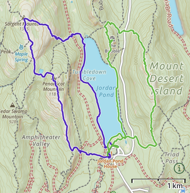 The summit is bare, with grand 360º views. Only a few other hikers were here, but it was still early. I turned south and down the ridge, into a col, past a tiny pond singing with frogs, and back up to the summit of Penobscot Mountain. From here there are nice views of Jordan Pond and, to the south, the Gulf of Maine.