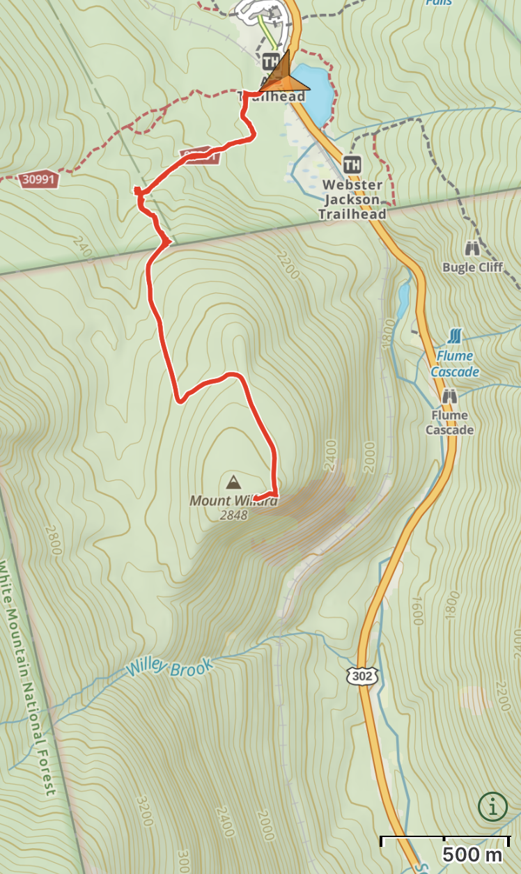 Today broke clear and cool. I wanted to get out for one more hike, before we had to head home. From the Mount Washington Hotel I have found many lovely, short hikes, doable before breakfast. I selected the most convenient, the short jaunt up Mount Willard. It’s one I’ve visited many times. It includes a nice waterfall and a grand view south along Crawford Notch.