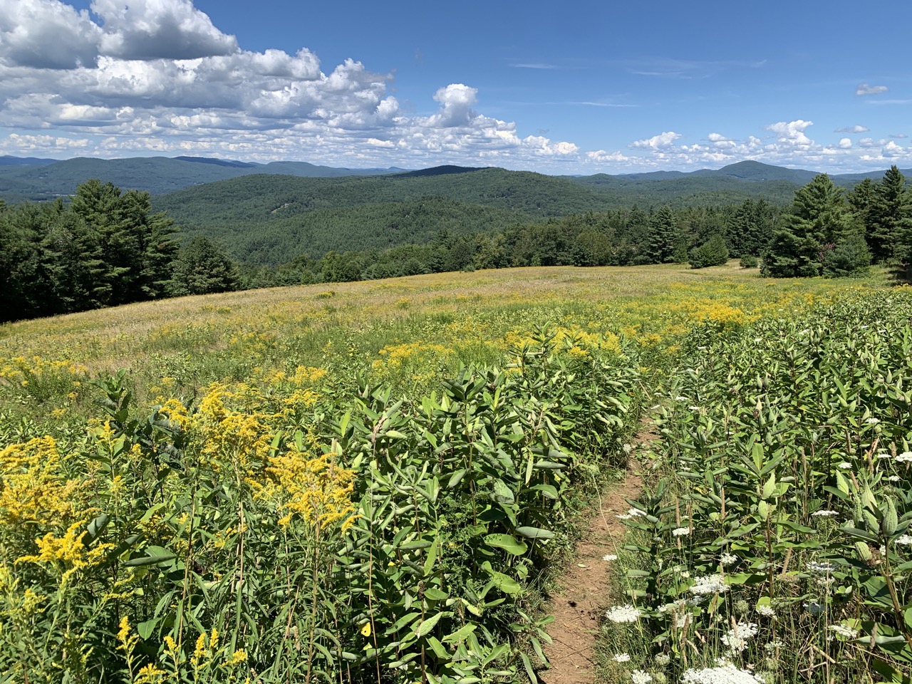 August is a time of quiet in the meadows and forests of New Hampshire, as the plants and animals enjoy the long days of late summer after the busy days of spring and early summer. This afternoon I strolled down from the summit of Lyme Pinnacle, through a mature meadow filled with goldenrod and Queen Anne’s Lace, with the crickets chirping and a light breeze blowing puffy clouds in from Vermont. Very peaceful.