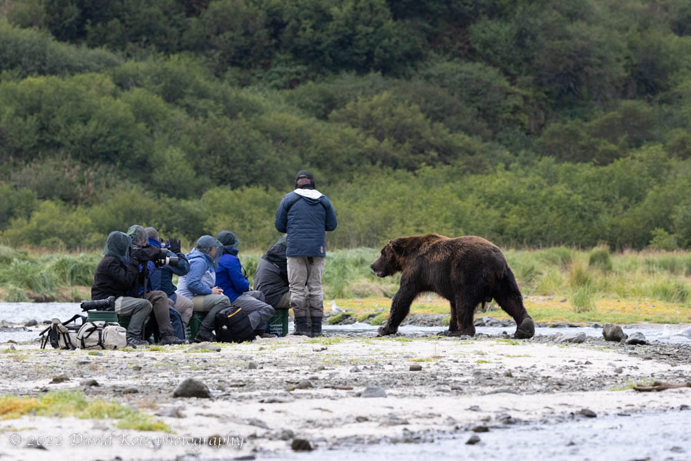 Sunday (August 28) Geographic Harbor: We rose for an early breakfast so we could return to the beach during low tide. Many bears were out today, as was another group of photographers. There are no lodges or cabins or roads with access to the extensive shoreline of Katmai National Park, so visitors all arrive by ship or plane and groups (like us) sleep on-board ships. Throughout the trip we were often the only group in a bay, and thus on shore; sometimes there was one (or maybe two) other boats sharing the same bay (and beach). Rarely, we’d see a small group of day-trippers arrive by floatplane. The guides, like our Captain Rob, all knew each other, and there was a tacit understanding that groups stayed out of the way of each other; still, it was sometimes possible to photograph bears as they passed by another group.