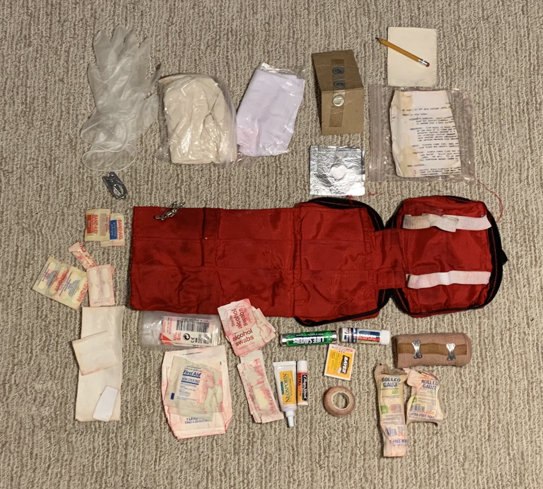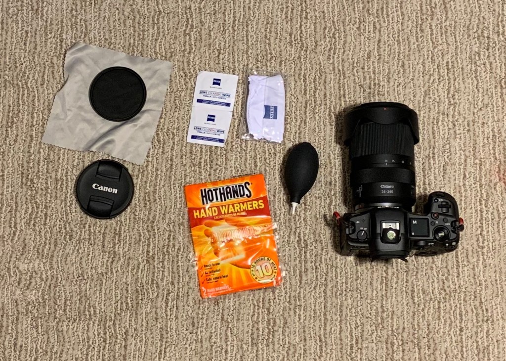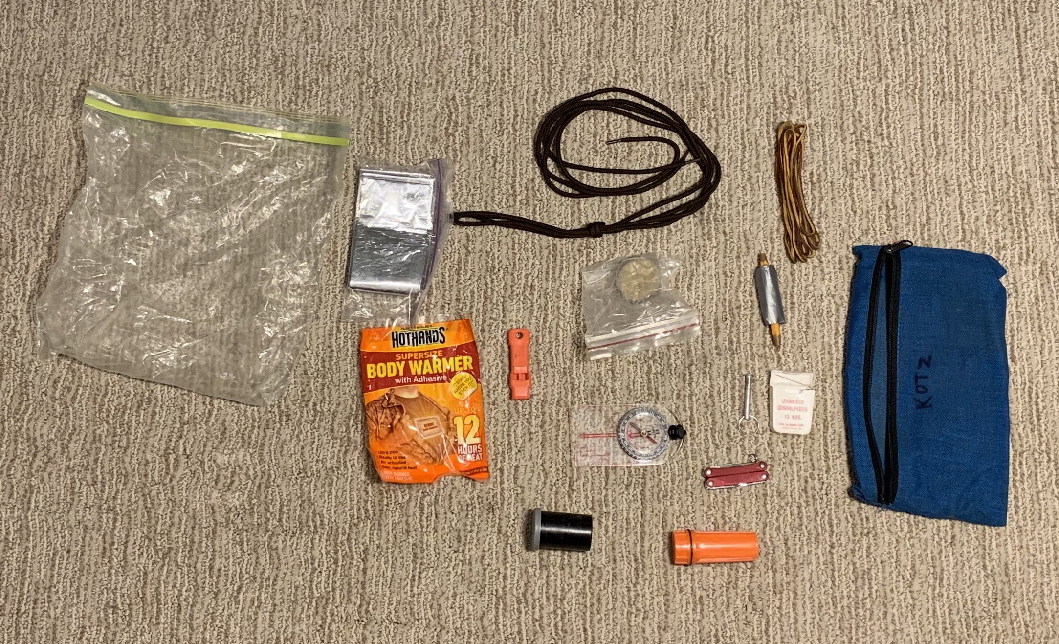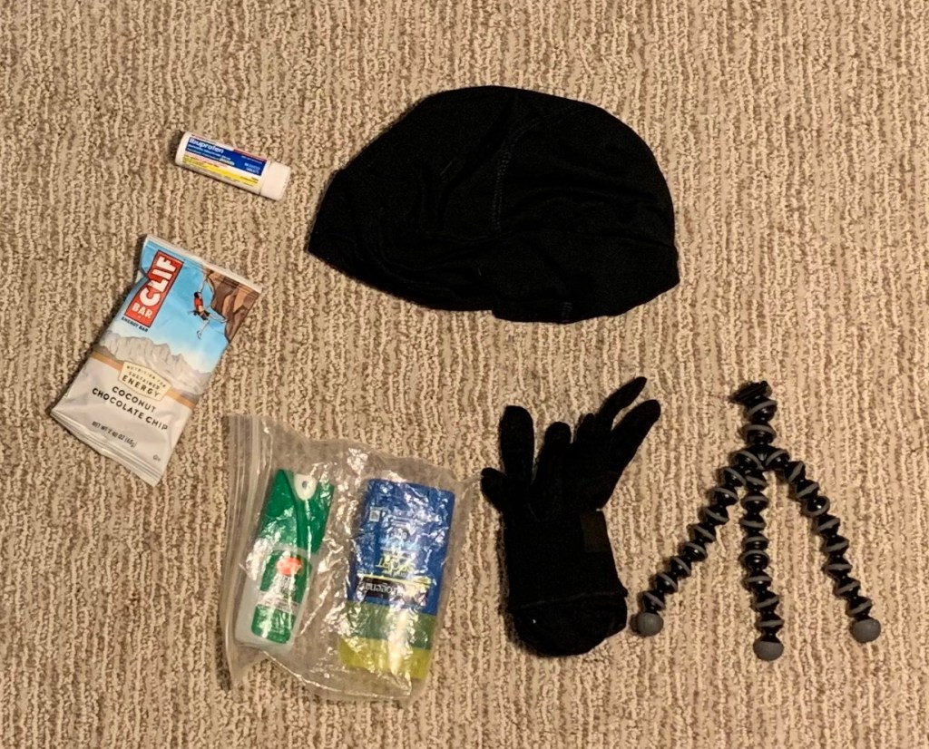 Mindshift Rotation 180º pack.On the outside: trekking poles, Goretex cap, pack raincover, toilet kit, and Garmin inReach satellite emergency beacon.In the top pocket: silk hat and gloves; GorillaPod tripod for iPhone, compact bug spray and sunscreen, Clif protein bar, ibuprofen. In the side pocket: hydration pack, 2.5LIn the main pocket, Goretex rain/wind shell, fleece jacket.In the main pocket: kite (left), emergency kit (top), hand-size water filter/pump (top right); lip balm, Swiss Army knife, spare headlamp batteries; business card (identification); power bank and Lightning cable (to charge iPhone); covid mask. Inside the emergency bag: spare wool socks, silk gloves, first aid kit, repair/emergency kit, bivvy sack, headlamp and spare batteries, spare prescription glasses, chemical warmers.The repair/emergency kit (nylon zip bag with ziplock plastic liner) includes a mylar emergency blanket, chemical body warmer pack, whistle, candle, compass, Leatherman multi-purpose tool, two waterproof match cans, tiny leather bootlaces, nylon bootlaces, clevis pin & ring, pencil wrapped with duct tape, dental floss with needle. Inside the First Aid kit: latex gloves, triangle bandage, fabric for bandages, coins for a payphone, tinfoil, emergency instructions and paper/pencil for recording patient assessment (which dates back to 1985 Freshman Trips!), folding scissors, moleskin, band-aids, steri-strips, bandage tape, neosporin, chapstick, aspirin, ibuprofen, Lifesavers candy, gauze rolls, ace bandage, safety pins. (After this photo I refreshed some of the worn-out band-aids and bandages.)Inside the camera pouch (the Rotation 180º pack is specifically designed for cameras): Canon R5 with 24-240mm lens (and hood and cap); dust blower, hand warmers, lens cleaners and wipes, lens filter (circular polarizer), spare lens cap.