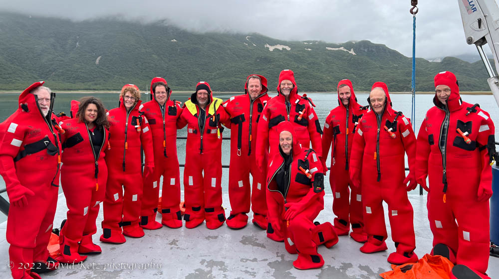 The ship’s captain (Rob) walked us through the ship’s safety features, including practice donning “immersion suits” that would be required in an abandon-ship emergency.