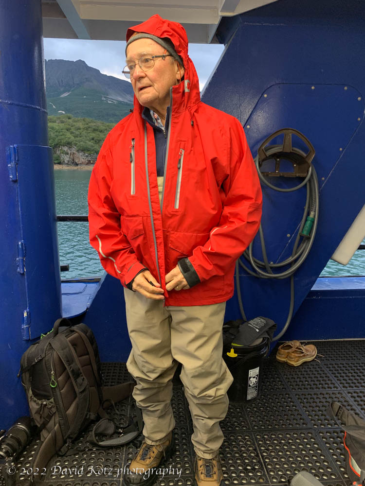 Tides dictated that many of our shore excursions would occur in early evening, when low tide exposes the vast beaches at the head of Geographic Harbor – and where the river splits into numerous shallow rivulets perfect for the bears to capture salmon. For every visit to shore we donned heavy-duty waders, then bulky boots, and topped it off with a raincoat. This outfit worked remarkably well, keeping us warm and dry even when we had to leap out of of the skiff into shallow water, or when the skies decided to drizzle on us for hours.
