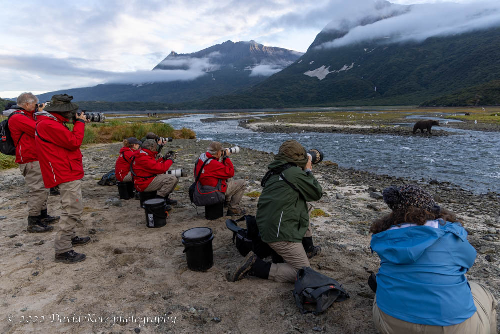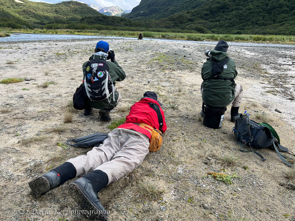 Meanwhile, we enjoyed photographing the bears that were fishing in the streams near us – often “getting low” to photograph bears at eye level. That’s me on the left; I rarely felt it useful to shoot prone.