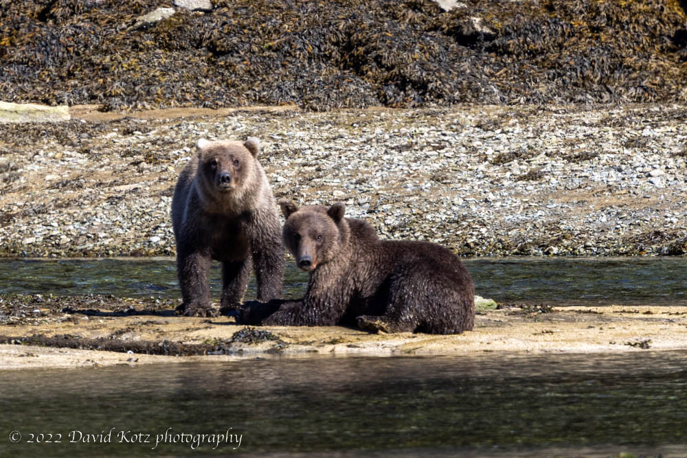 To catch the tide we rode the skiffs to shore as soon as we anchored. The terrain here was very different than Geographic Harbor – at low tide, the river cascaded over rocks to a narrow beach, all of which disappeared at high tide. Arriving at low tide, we paused on the beach to watch a sow and her two cubs exploring these shallows.
