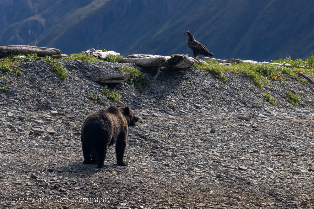 Tiring, and with the tide returning, we turned around and headed back to the bay shore. As we climbed into the skiff we saw a bear swimming nearby, then scrambling out of the water and up a steep bank. Hey, someone noted, there’s an immature bald eagle sitting at the top of the bank; this could be interesting!