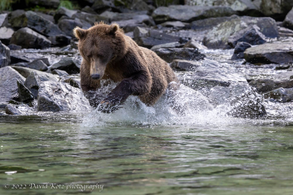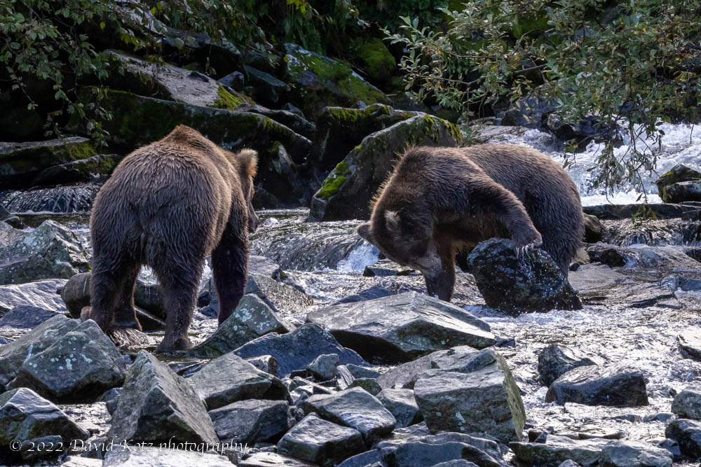 Our route took us back to the shore of the same river, where we met the sow and cubs again, now fishing upstream. Another group had staked out the shoreline at a bend in the river, less than 50m upstream, and were treated to some excellent photography as bears chased, caught, shared, and ate fish right in front of them. We could only watch at a distance, rarely with good photo angle.