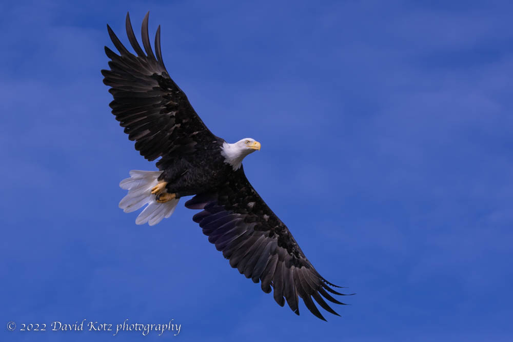 On our way back to shore, we found an adult bald eagle perched in a tree, surveying the beach. We watched until it launched from its perch to swoop across the bay…