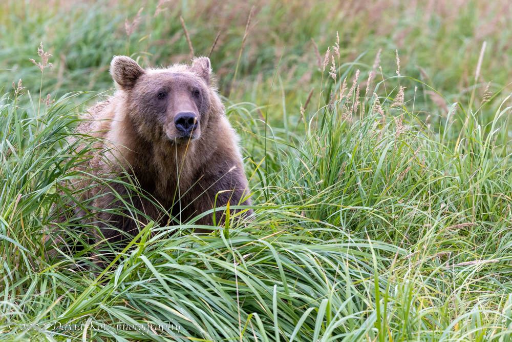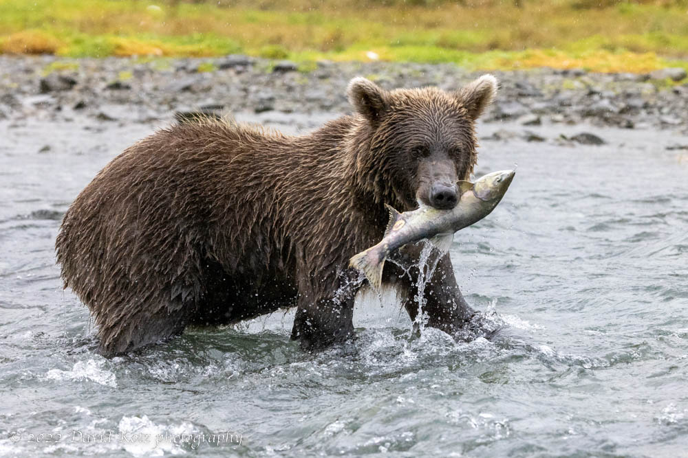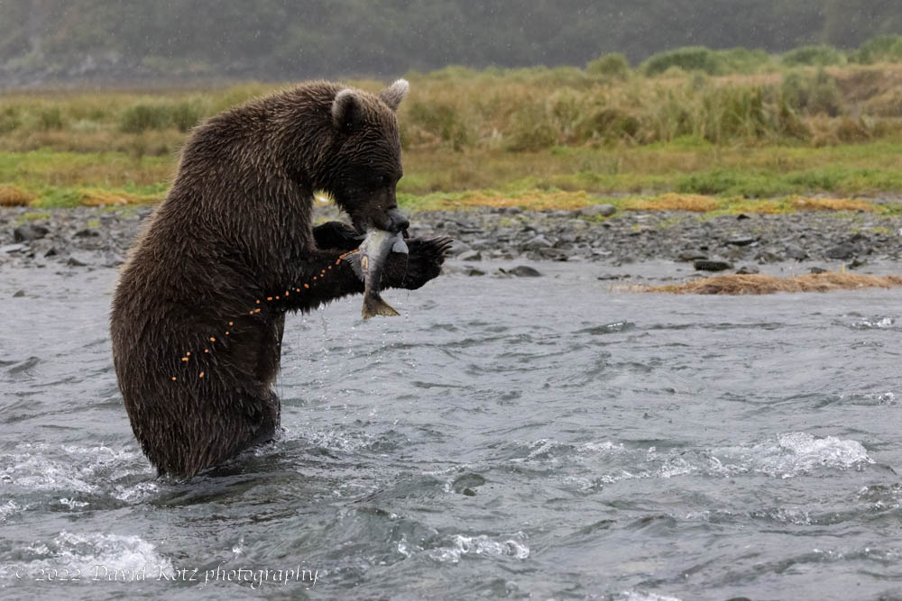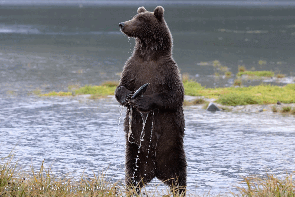 In the evening we went back to the beach, but the tide was still very high. My favorite moment from that evening was when this young bear stood up, holding his catch, to keep an eye on a bigger, older bear that seemed to be coming his way. He sniffed his fish, decided it was not worth it, and turned to head away. I snapped 30 frames at a high frame rate, and reconstruct the sequence here: