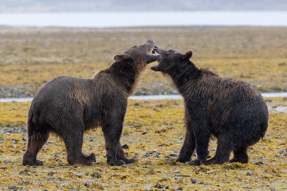 On our long walk out – these bays have huge tides and the beaches extend by hundreds of meters at low tide – we followed a pair of affectionate bears (siblings?) nuzzling and wrestling and playing while they walked along.
