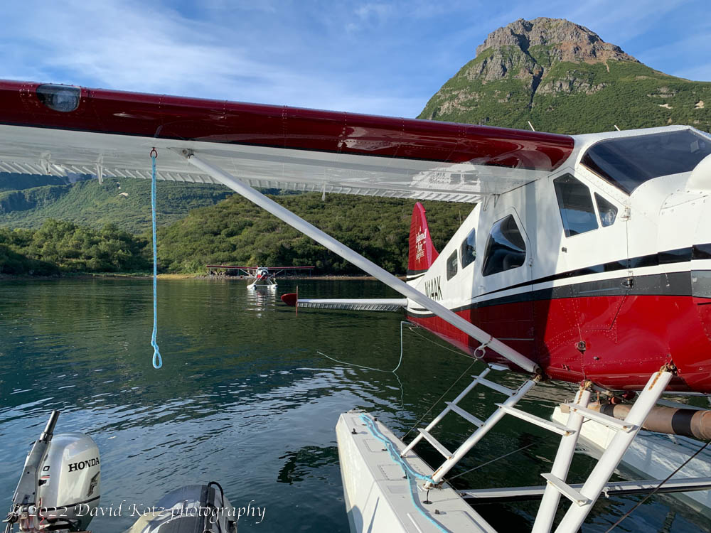 After breakfast and packing, we hung about the ship while we waited for three floatplanes to arrive. Although they were a bit late, each dropped into Geographic Harbor, then pulled up to the stern of the Dreamcatcher so we could board in weight-balanced groups. Below, one plane at the stern while another waits behind.