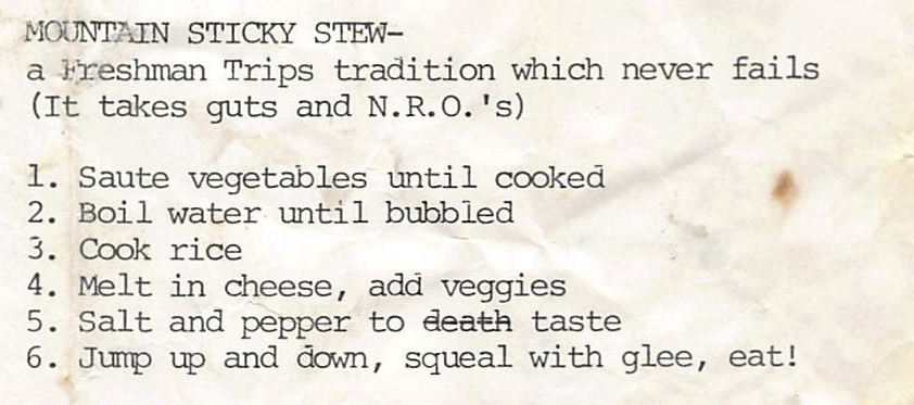 Check out the gallery of scanned photos (including some I later retrieved from The Aegis sale of surplus prints) and original documents, including the crumpled and pocket-folded menu for 1982 Trips, including this classic recipe for Mountain Sticky Stew: