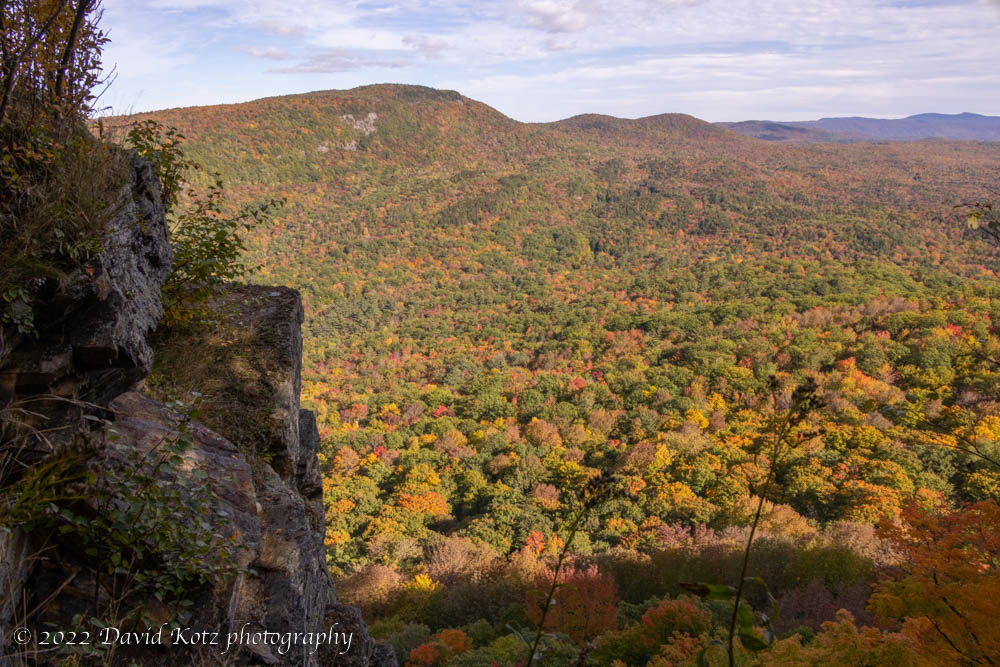 I’ve been meaning to get out hiking, in the high mountains to the north – knowing that the fall colors will arrive several weeks sooner there than here. But somehow the colors snuck up faster than I expected. I went today for one of my favorite nearby hikes – to the top of Holts Ledge, the cliff-faced ridgeline on which the Dartmouth Skiway sits. The Applachian Trail rambles over this hilltop, brushing the tops of the cliffs and providing fantastic views to the south and east.