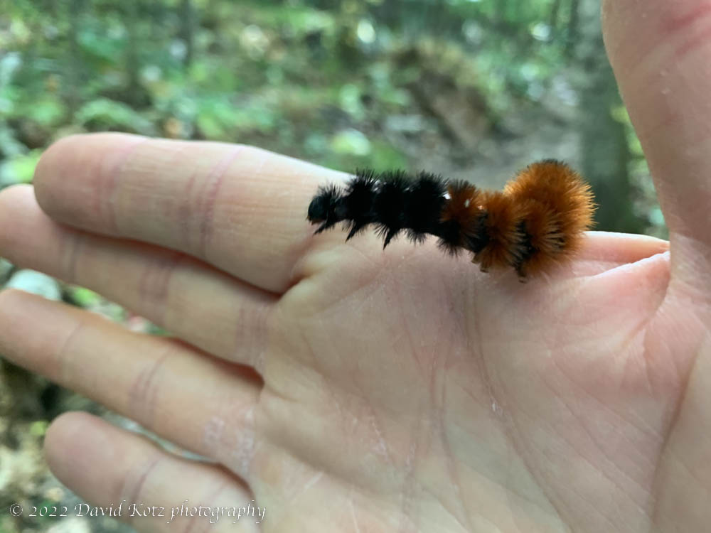On the way down I encountered a wooly bear caterpillar, one of my favorites. He explored my palm for a while, looking for a way across. Soon I put him back down, to go about his business on the forest floor.