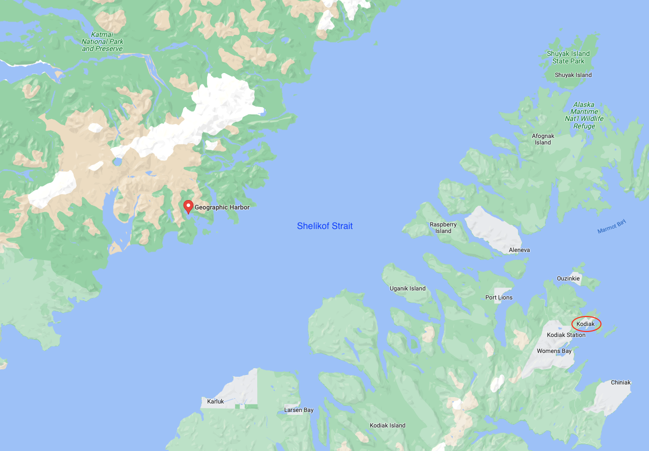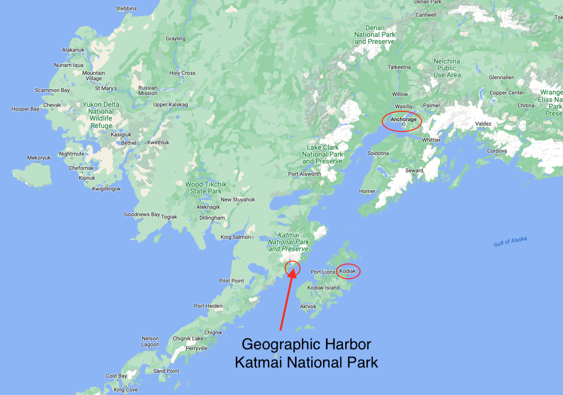 Location: below are two maps – hopefully the first is recognizable as Alaska, and the second is a close-up of the Katmai-Kodiak area. [Google Maps]