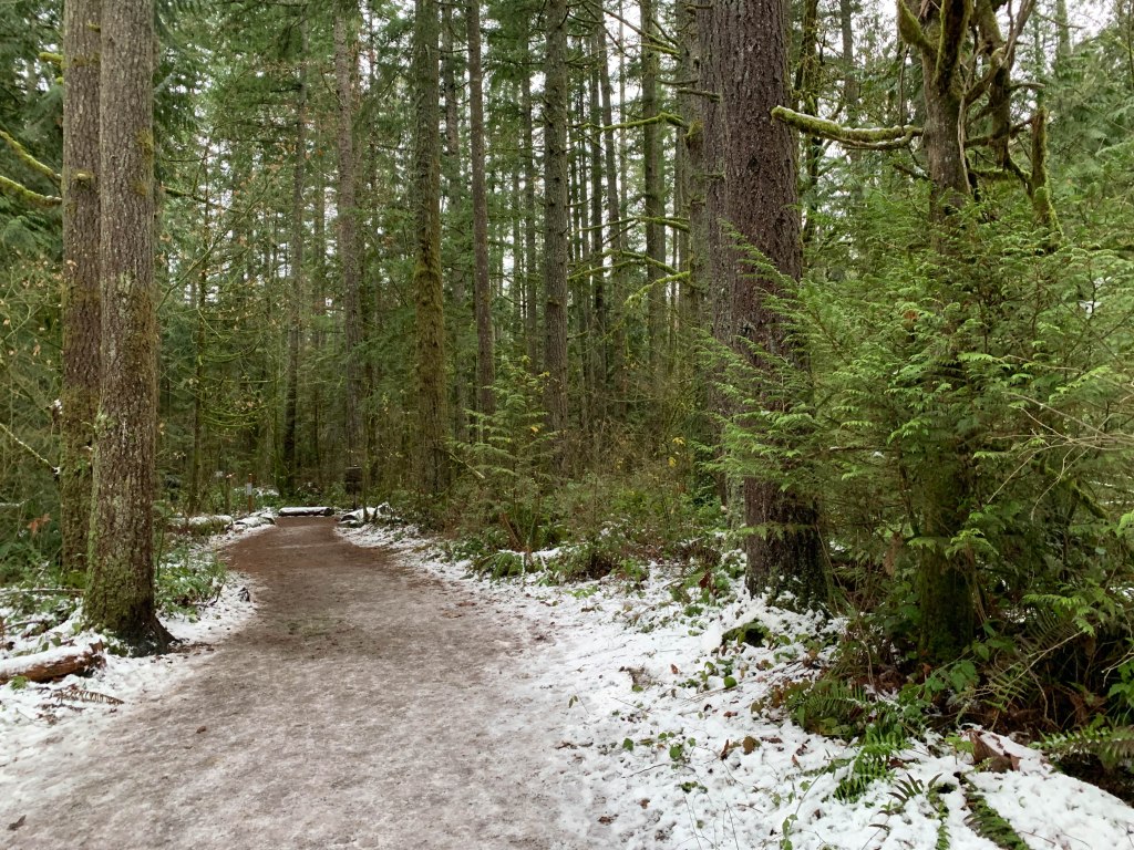 Today I had the opportunity to visit Jon, a friend and former student, after arriving in Seattle late last night. We drove east of the city to a natural area called Tradition Plateau (and also, it appears, Tiger Mountain). It snowed a little yesterday, so the trails and surroundings were covered with a thin layer of wet and crunchy snow. The verdant forest I so associate with the Pacific Northwest was still evident, as were the incredibly tall and thin cedars and firs of the sort we just don’t see out East.