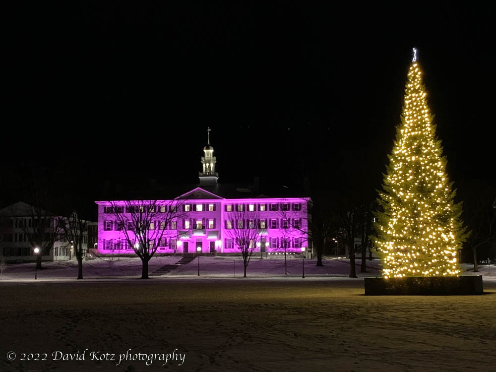 Christmas tree and illuminated Dartmouth Hall, Hanover.