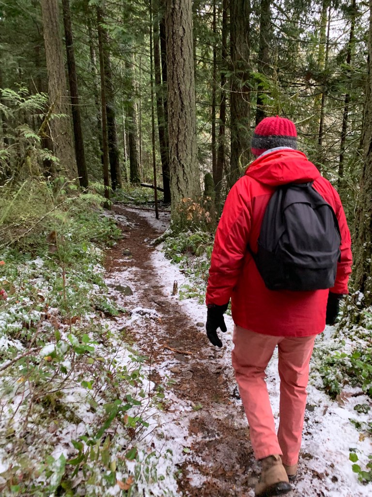 Today I had the opportunity to visit Jon, a friend and former student, after arriving in Seattle late last night. We drove east of the city to a natural area called Tradition Plateau (and also, it appears, Tiger Mountain). It snowed a little yesterday, so the trails and surroundings were covered with a thin layer of wet and crunchy snow. The verdant forest I so associate with the Pacific Northwest was still evident, as were the incredibly tall and thin cedars and firs of the sort we just don’t see out East.