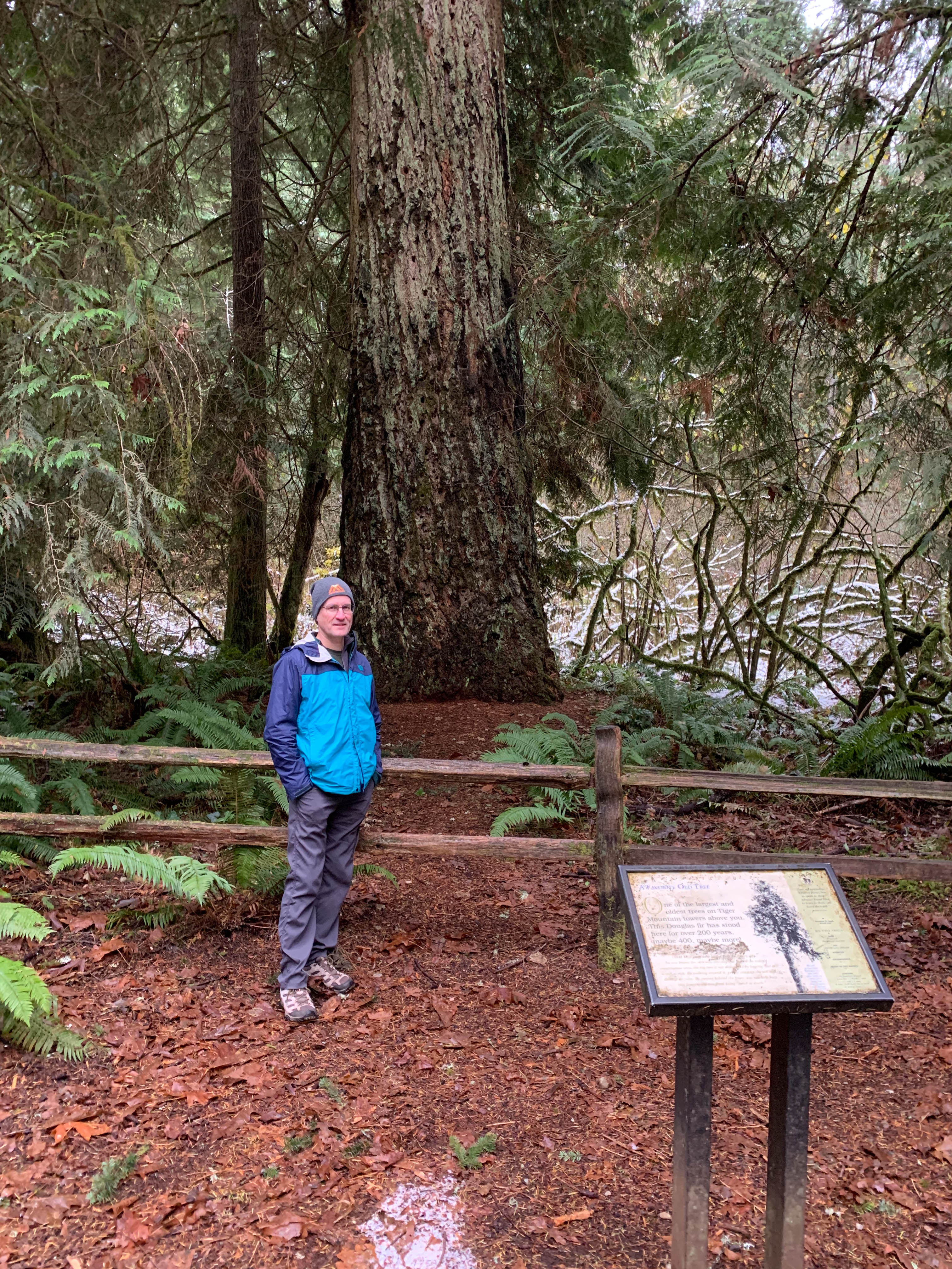 We paused at a sign for “Big Tree”, a massive Douglas Fir nearly eight feet in diameter and 25 feet in circumference. According to the sign, the tree is 200 years old… perhaps 400 years old?