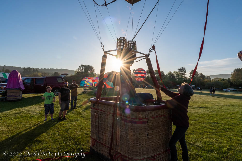 May – Post Mills, VT. There has long been a balloon festival at a tiny grass airstrip, at the break of day when the air is cool and still. I love the color of the balloons and the quiet chatter of the enthusiasts who meet to enjoy their sport. I like how the starburst peeks around the corner of the burner, evoking its power, as the balloon fills with hot air and is ready to soar. [Blog post]