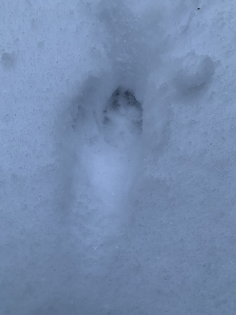 The fresh snow clung to the trees, weighing down their branches. The firs and hemlocks provide cover for the deer, and I often find their “beds” under these snowy branches. This morning was no different, as I passed five or six fresh beds, depressions where the snow has melted under the warm bodies of sleeping deer. Close by, though, I was treated today to a new set of tracks, trotting through the snow and pausing to check a tiny underground burrow I’ve noticed for several years. The tracks did not enter the burrow – but I imagined the passing creature spending a few moments to sniff the burrow to see what might be living inside. It’s very hard to photograph tracks in snow, but I made an attempt below. Later examination of the Scats and Tracks handbook, back home, leads me to believe this hunter to be a red fox. They are a fairly common sight in our neighborhood; see my photo from last fall.