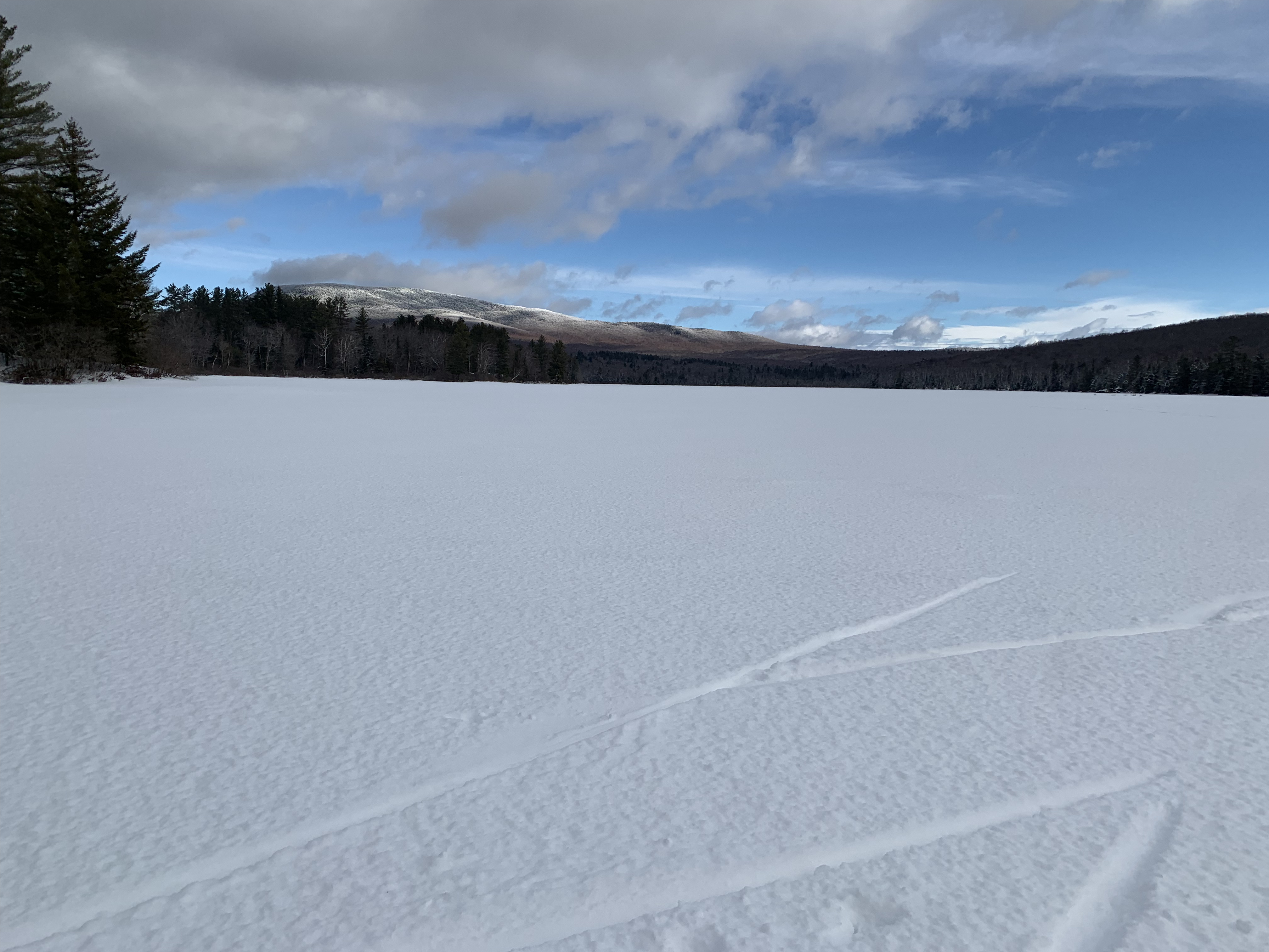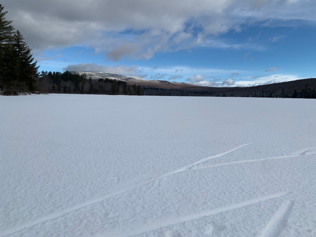 Smarts Mountain looms beyond the pristine surface of Cummins Pond, scratched only by the tracks from a pair of early-morning skiers.Continue reading “Winter’s last gasp”