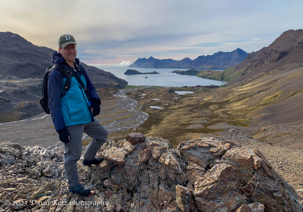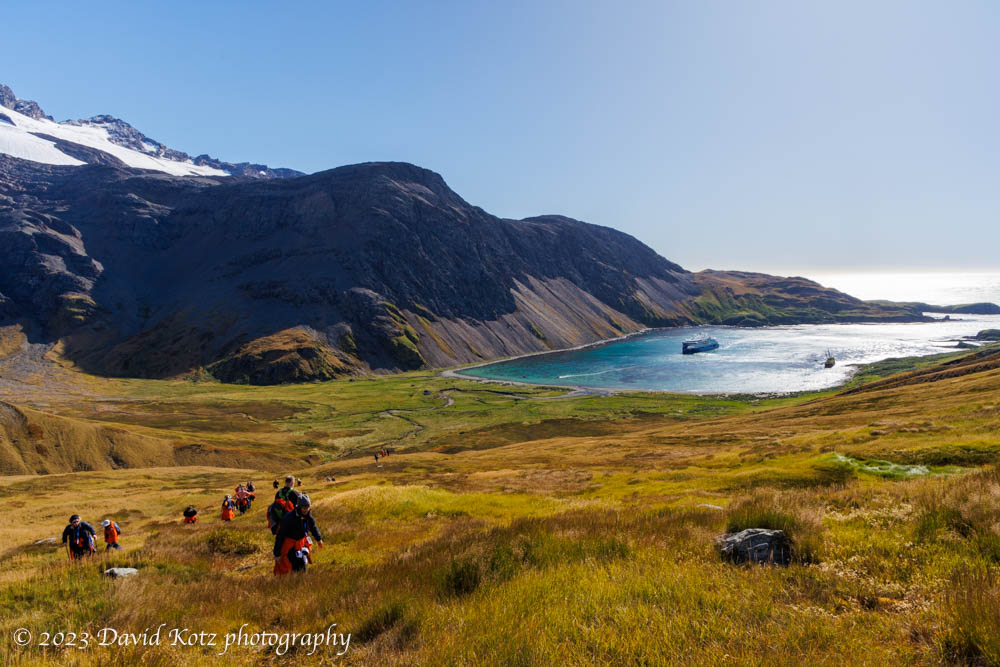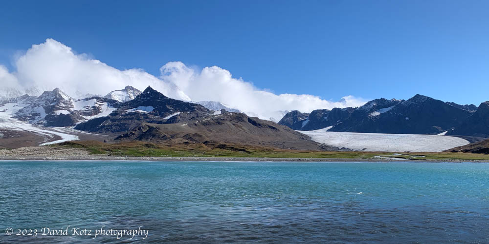 On the way back we walked to an overlook where we had a sweeping view from the bay to the Buxton Glacier and across a massive colony of King Penguins – scientists estimate 130,000 pairs, which translates to nearly 400,000 penguins. In the photo above the shore at left is speckled white: those are penguins!