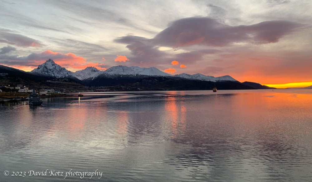 I’ll write more about the cruise in subsequent posts, but allow me to jump ahead two weeks to the end of the cruise – when we had once again docked in Ushuaia. We awoke early the next morning to a spectacular sunrise glimmering across the calm waters of the Beagle Channel, with the season’s first dusting of snow decorating all the surrounding peaks.