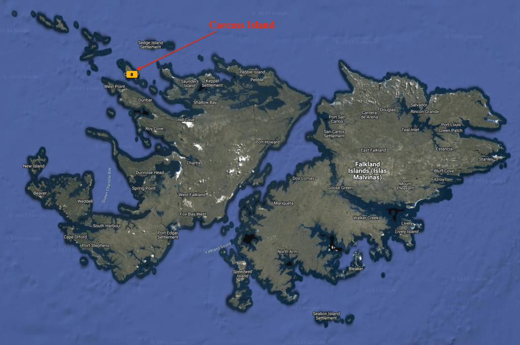 Our last stop in the Falkland Islands was on Carcass Island. As Wikipedia notes, its “grim-sounding name comes from the ship HMS Carcass, which surveyed the island in 1766.” Despite the grim name, we visited on a beautiful day and had a lovely hike up the steep and grassy slopes, past a small Gentoo settlement and through sheep pasture, to a rocky summit with broad views of the bay and surrounding islands.