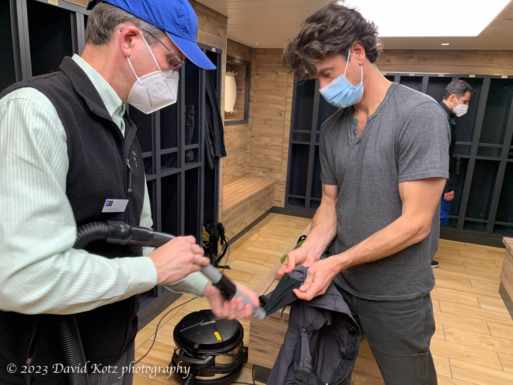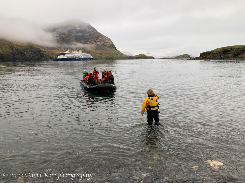 The expedition deck (“Base camp”, deck 3) provided a locker for every guest to store their shore gear – notably, waterproof overpants and tall boots that enabled us to make the “wet landings”, hopping out of a Zodiac boat as it pulls up onto the beach, wading through the surf, and later walking through the wet brush and mud of the shores of South Georgia. I was impressed by the expedition crew’s efficiency at launching several Zodiacs, safely off-boarding 100 guests from ship to shore, and later returning…