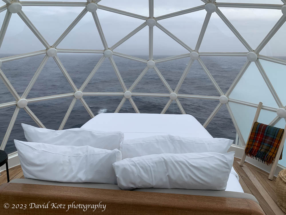 At any time one could wander the ship to grab a coffee from the self-serve café, use the gym, or peruse the library and check out the real-time interactive nautical chart. Every day the staff would open the spa, the sauna, the top-deck hot-tubs, and the ship’s gift shop. Not to mention the two “igloo” bedrooms one could reserve for an overnight visit, out on the top deck. (Can’t say I took advantage of all those things!)