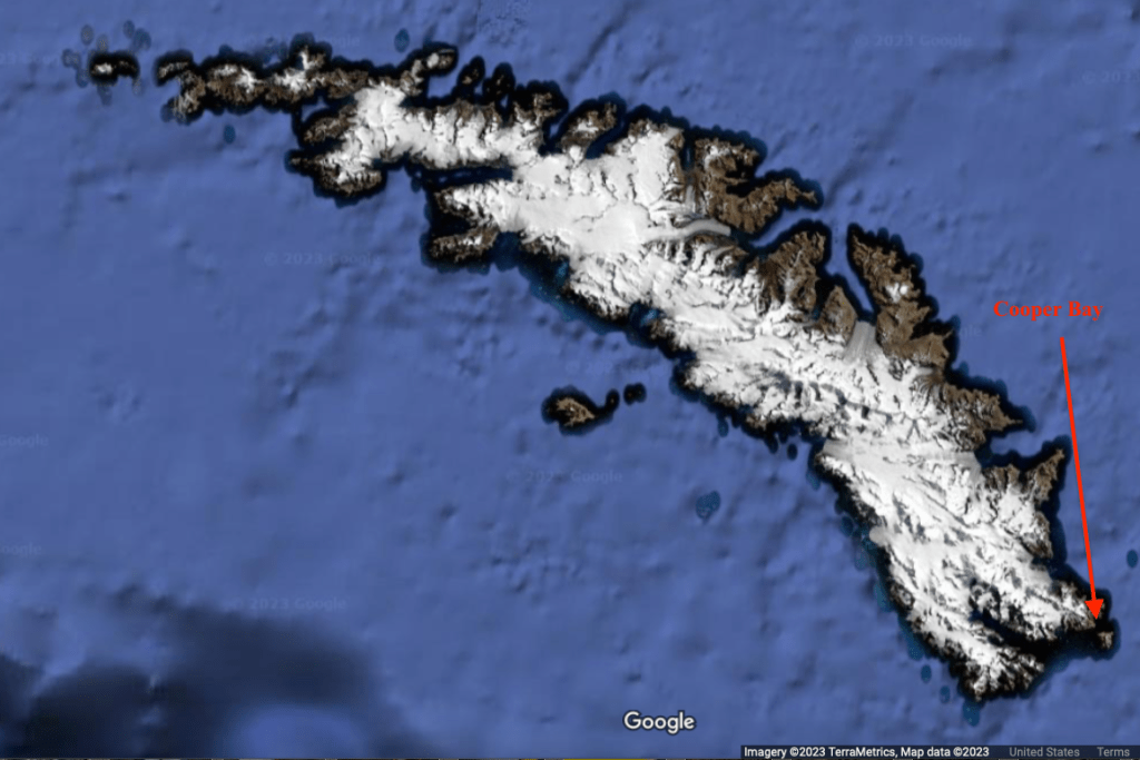 After a delightful morning in Gold Harbour, on the afternoon of 6 March we stopped briefly in a tiny bay on the southeastern point of South Georgia Island – Cooper Bay. We were not able (not allowed?) to land here, so they took us out in groups to tour the bay by Zodiac. On the beach we saw a small, mixed colony of penguins – Chinstrap, King, and Gentoo – and nearby a steep, rocky hillside frequented by Macaroni Penguins.