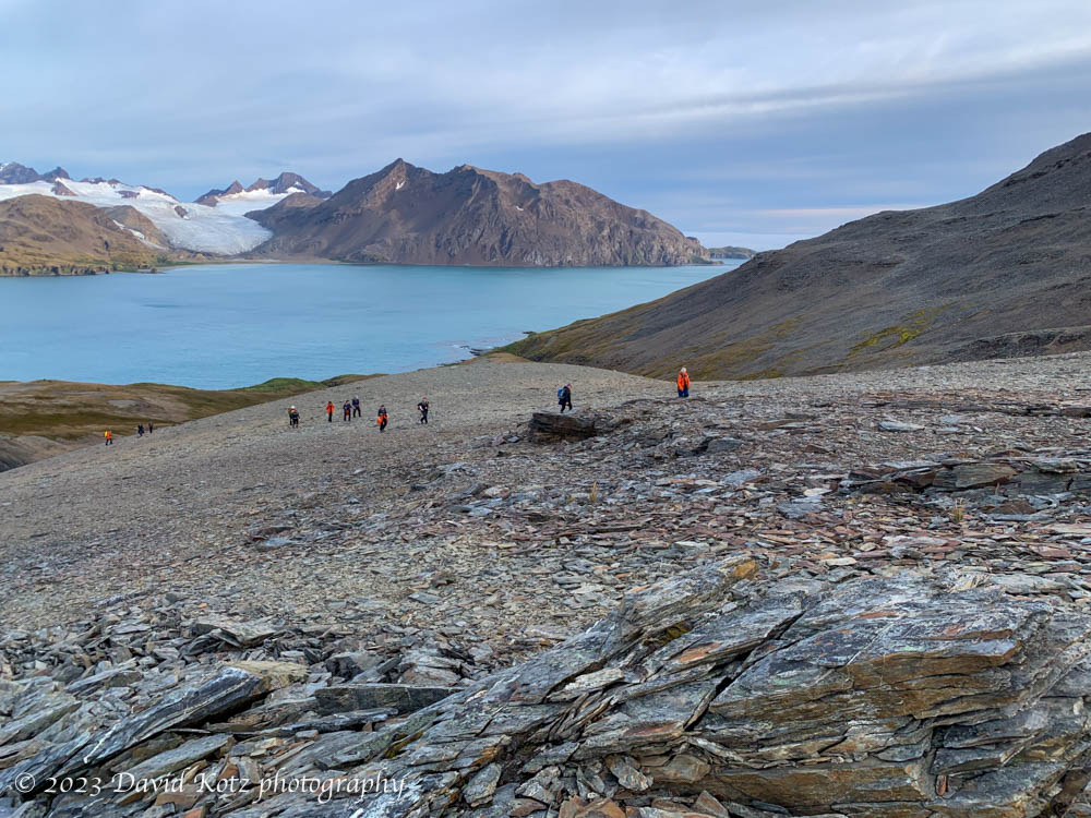Soon we left the vegetation behind and were hiking on loose scree, although when Shackleton scrambled up this way, it was covered in winter snow.