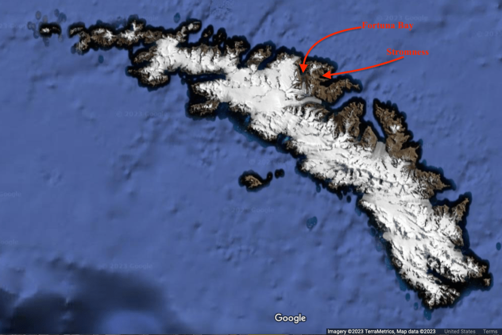 Here’s where we come in, nearly 107 years later. Early in the morning of 9 March 2023, we put ashore in Fortuna Bay – a spot now known as Worsley Beach – and trekked up the steep and boggy grass slope in the footsteps of Shackleton, Worsley, and Crean.
