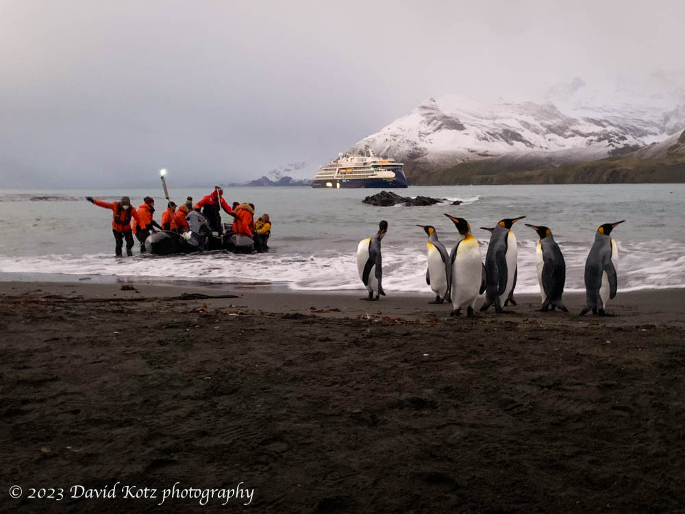 Our first opportunity to land on South Georgia was in Right Whale Bay, on the morning of 5 March. The stony beach was home to several thousand King Penguins and hundreds of fur seals. We were able to wander among the seals, across the grass, and around the edges of the penguin colony, slopping through the mud, penguin guano, and wet rocks. The weather threw us a bit of everything – drizzle, flurries, sleet, sunshine, and a stiff wind bursting downslope from the glaciers above. We were dressed warmly and the excitement of meeting penguins face to face – quite literally – made for an exciting morning. Read on and don’t miss the gallery of photos and videos!