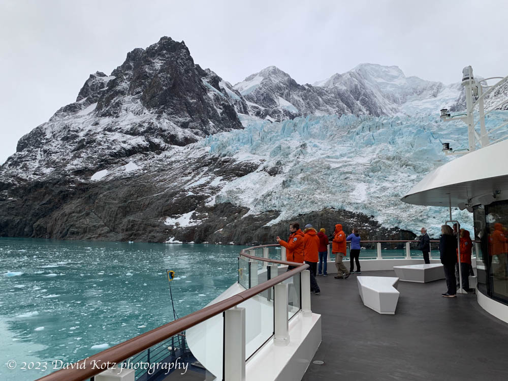 As the afternoon waned on 6 March, we sailed deep into a deep fjord at the southern tip of South Georgia, its walls lined with glacier after glacier. As the glaciers have receded – all too fast, in recent years – the fjord has gotten longer, and it took an hour for us to motor slowly “upstream” to the head of the fjord, where the Risting Glacier was actively calving into the tidal bay.