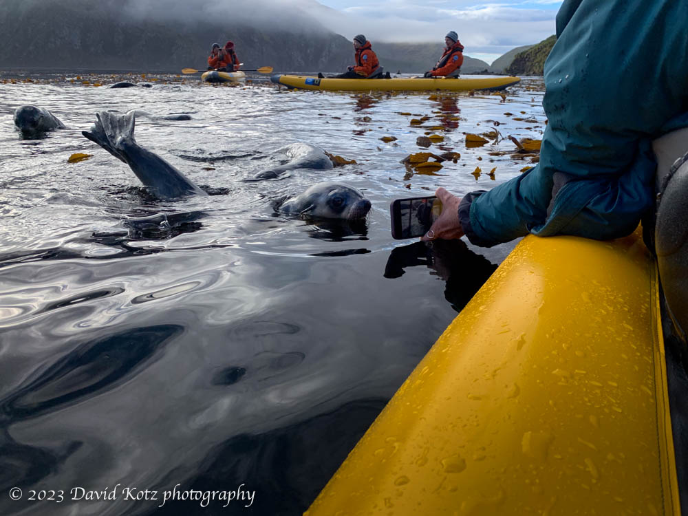 Our ship spent the sunny afternoon of 7 March in Godthul Bay. It was calm and clear, so they pulled out the kayaks and allowed us to roam (in pairs) around the bay. It was entrancing to simply park within the kelp forest and watch the fur seal pups frolicking – and they were as curious about us as we were about them! I highly encourage you to take three minutes to enjoy this video of the fur seals; for you, as for me, patience will pay off. You can almost imagine them, just like human children, daring each other to touch the kayak paddle!