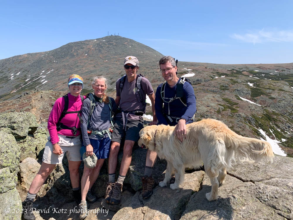 Today, we left one car near the western base of Mount Washington, hiked up the Ammonoosuc Ravine Trail to Lakes of the Clouds, where there is an AMC Hut, then followed the ridgeline south over Mounts Monroe, Eisenhower, and Pierce, before descending the Crawford Path to our second car in Crawford Notch. We were ably led throughout by the indomitable Karhu, who had a knack for sniffing out the right the trail and pausing whenever he reached a trail junction. We often stopped to enjoy the sunshine and nibble a snack.