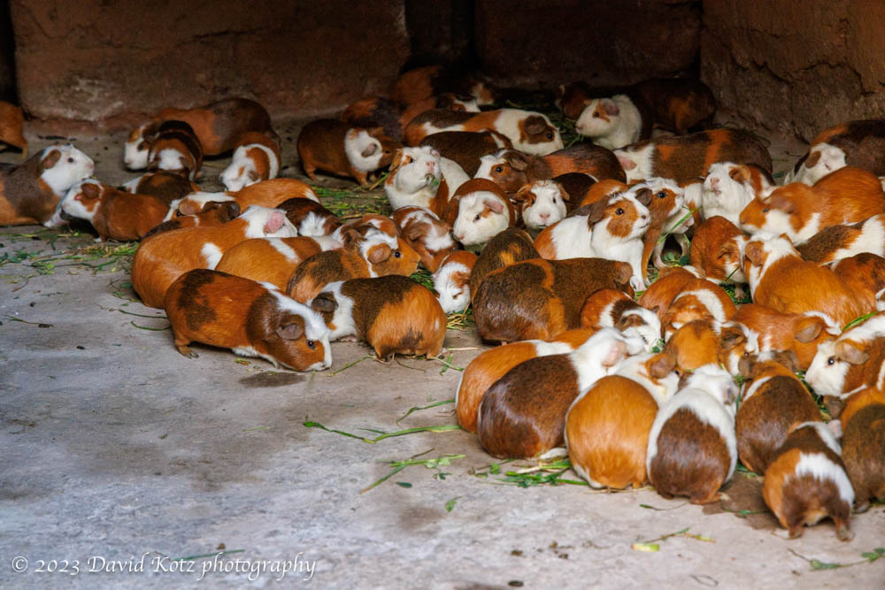 This farm was also our first opportunity to learn about the (current and historical) importance of guinea pigs as a meat crop. According to Wikipedia, “the guinea pig was first domesticated as early as 5000 BC for food by tribes in the Andean region of South America (the present-day southern part of Colombia, Ecuador, Peru, and Bolivia),” and they are still culturally important today. We frequently saw them, roasted on a stick, at roadside street-food vendors. The farm owner gave us a tour, including their pig house.
