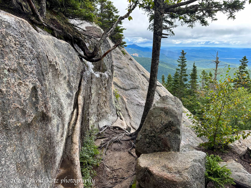 Fortunately, the ‘Walden Trail’ continues past the summit to a fine, rocky outlook – where a mix of clouds and sun enabled another fine view of Mount Chocorua, but not much else (photo below). Studying the map, I found the Walden trail would allow me to loop back to the aforementioned junction – why backtrack when you can loop? – so I followed it around and down. It was just as steep, now all the more tricky as I was descending.