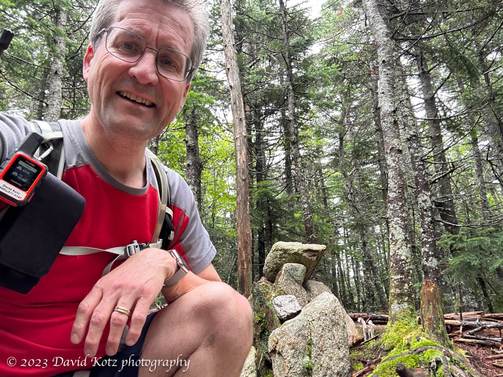 I wobbled up and down the connecting ridgeline for an hour before reaching the junction at the base of Passaconaway’s summit. I turned left and up toward the summit, and the trail soon became steep, then steeper. It finally ended at a spot in the woods where one stops, turns all the way around, decides it is not possible to go higher, and realizes it must be the summit. Ho hum.