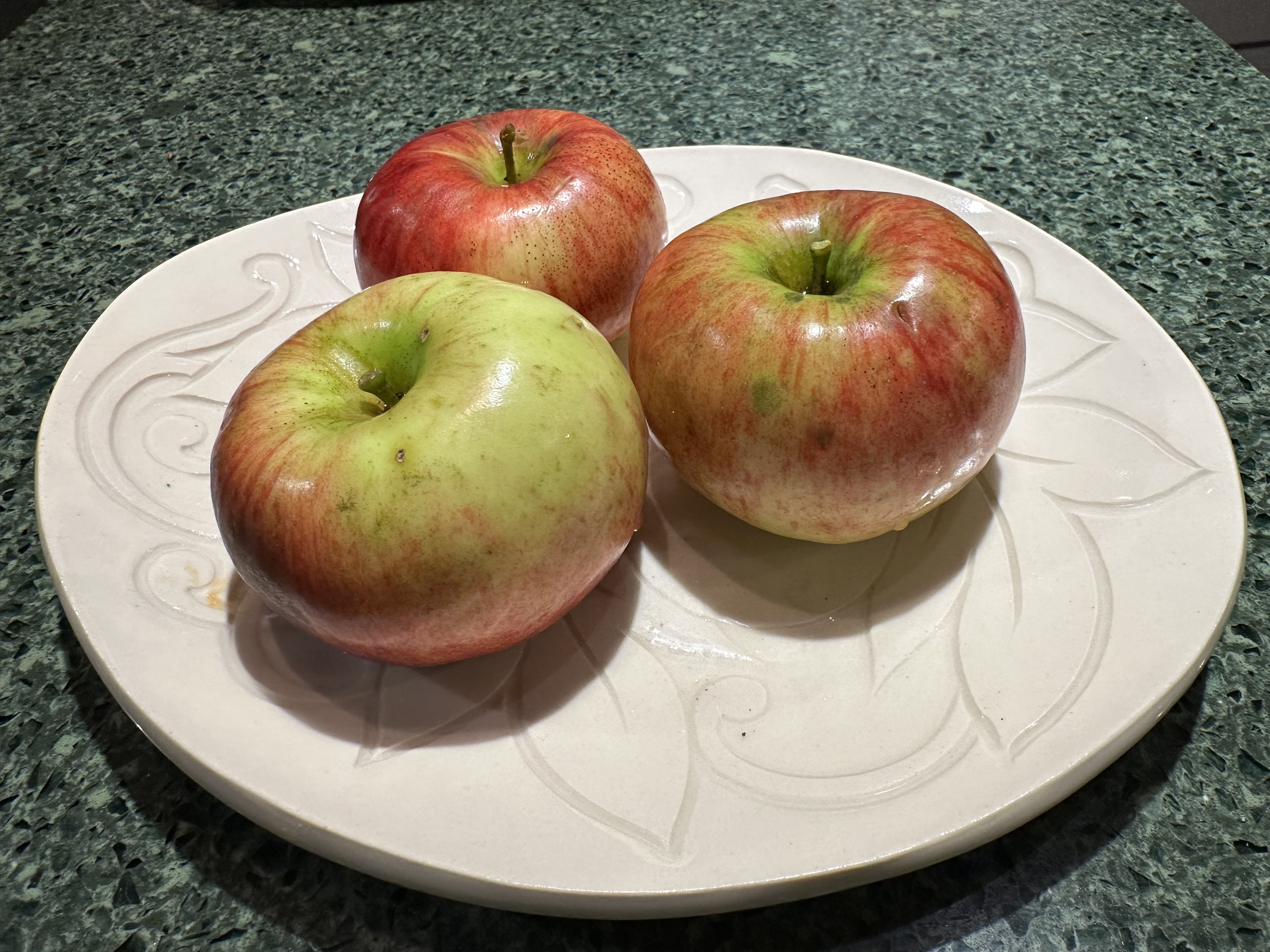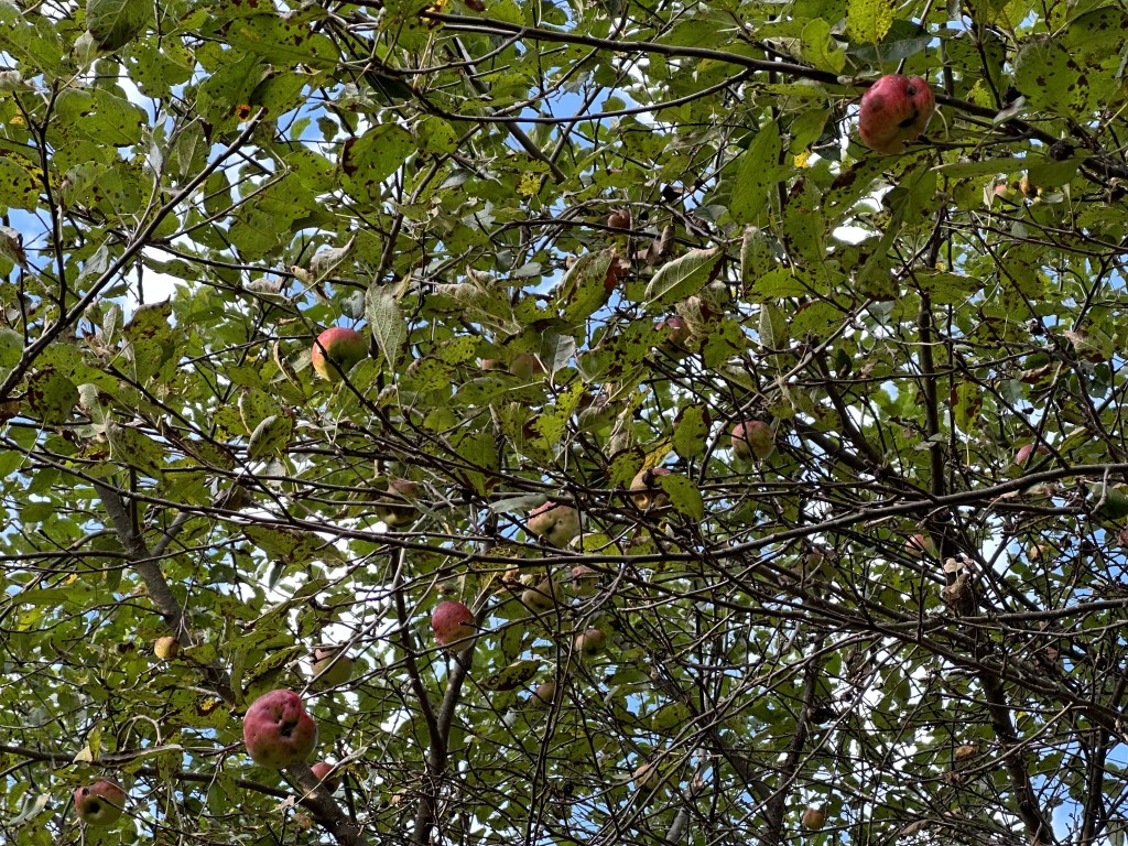 Fall has arrived, more or less – and that means it is apple season! We planted two apple trees in the backyard – one with McIntosh, one with Cortland apples. The Cortlands are heading for a bumper crop, and the deadfall have already been extremely attractive to all the local wildlife.