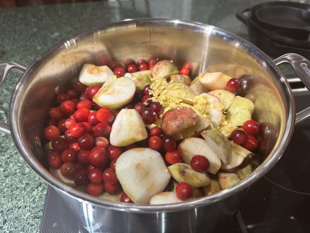 Cooked with some cranberries from the freezer, then spiced with cinnamon, nutmeg, ginger, and brown sugar, they soon became 5 quarts of cran-applesauce. Wow! We are set for the winter.